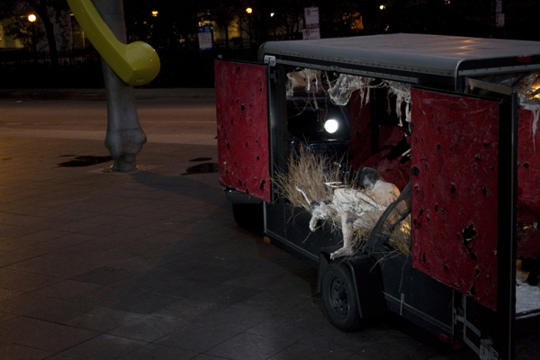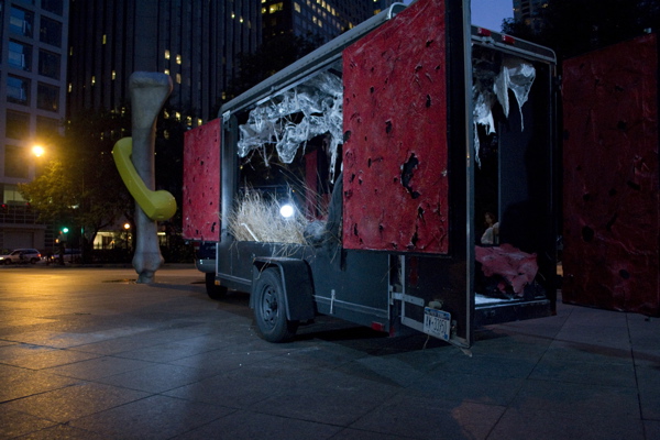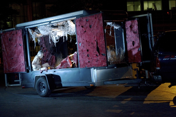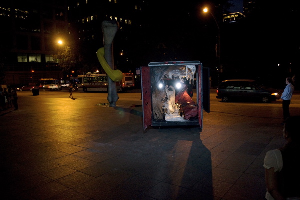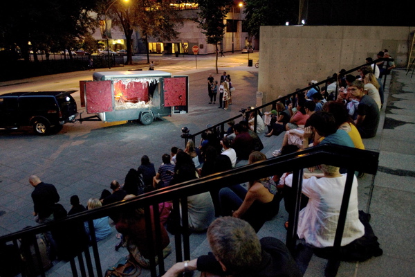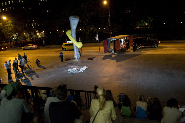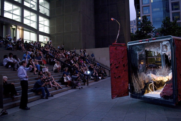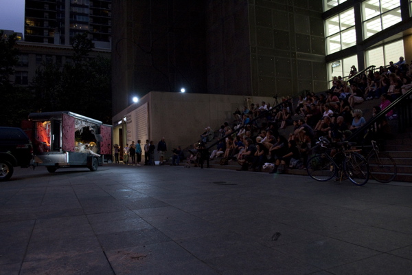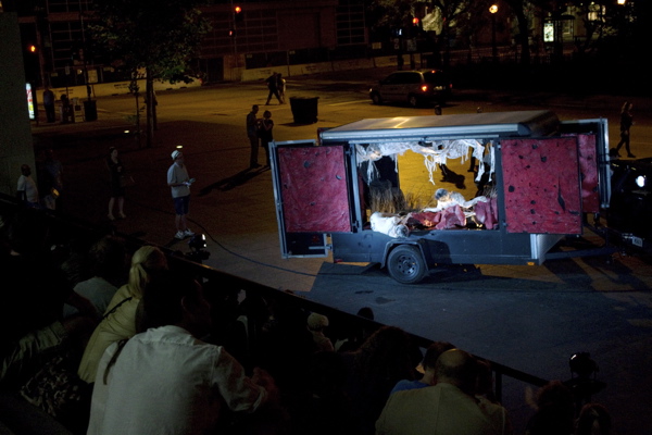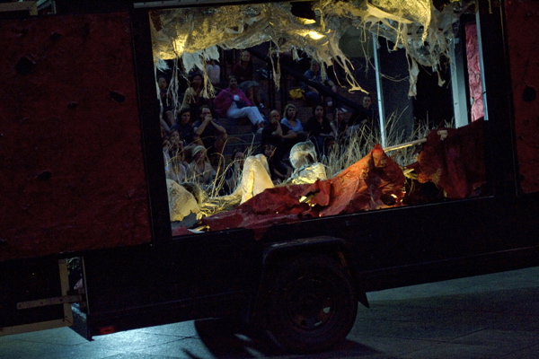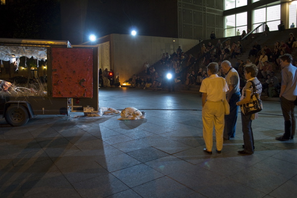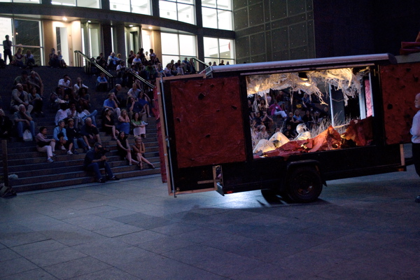 For the original Caravan Project, Eiko & Koma's jeep brought the trailer to the site and was then disconnected, leaving the trailer alone. For the performances this summer, Eiko & Koma kept the car hitched to the trailer so that they could choreograph the movement of the trailer. During the show people could see the caravan come to the site, change locations and angles and leave the plaza for an unknown destination. It was a new way to perform the work. During these performances, Eiko & Koma wore costumes developed for Trilogy and Event Fission.