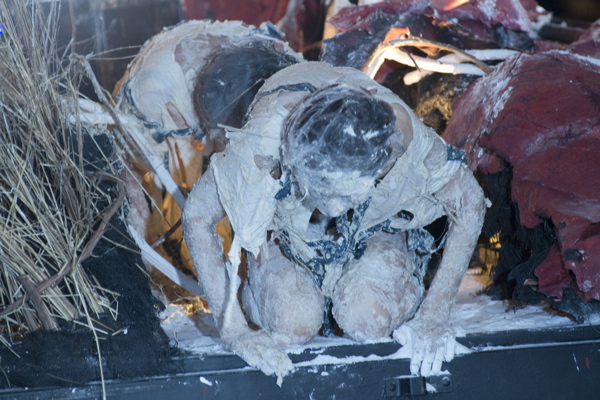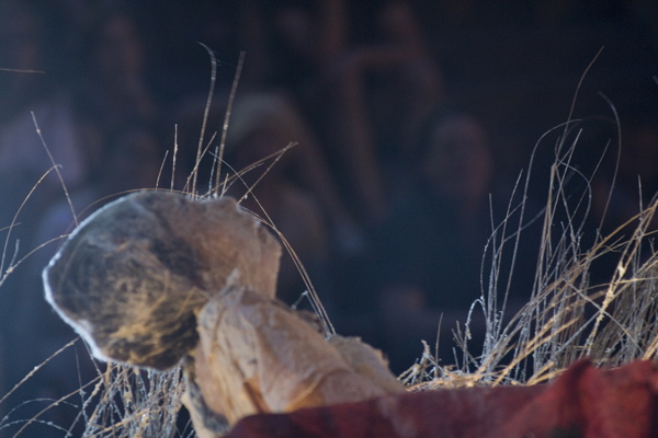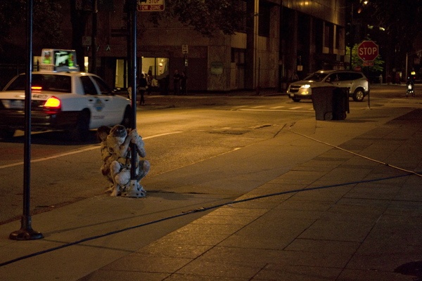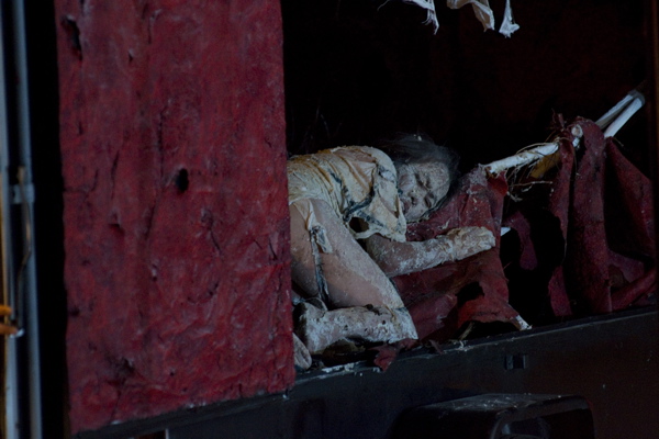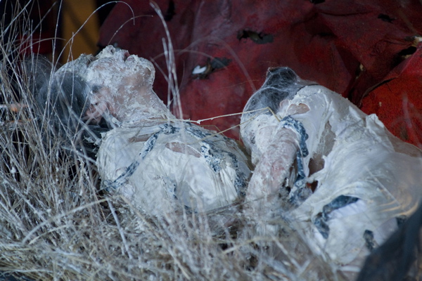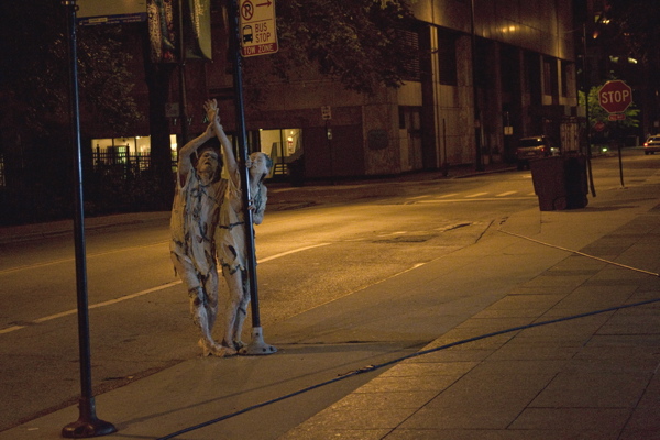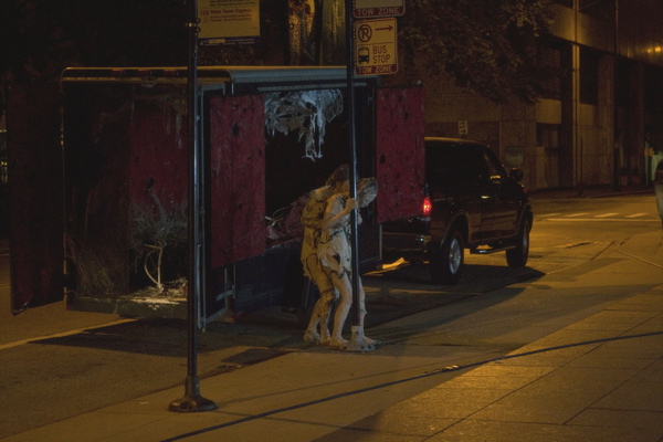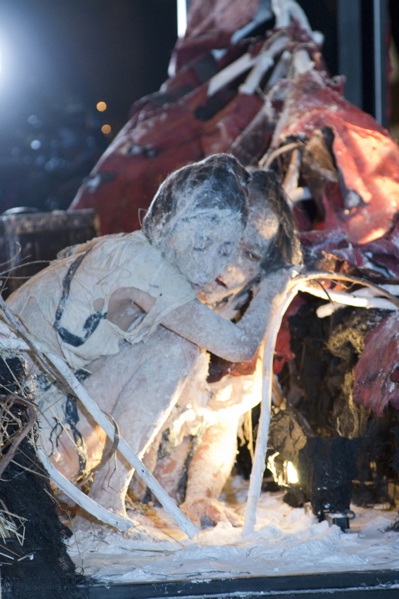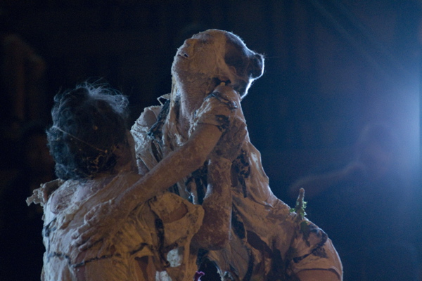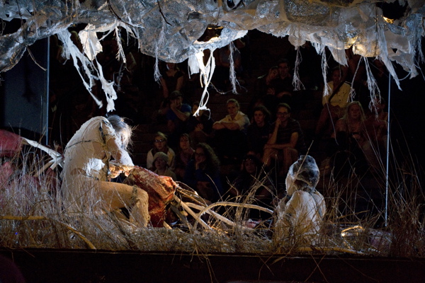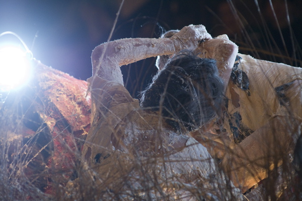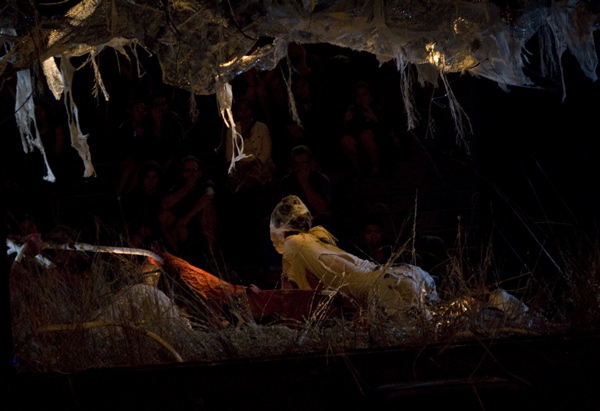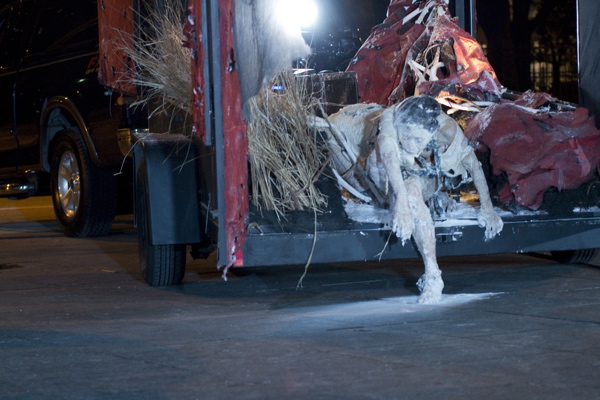 For the original Caravan Project, Eiko & Koma's jeep brought the trailer to the site and was then disconnected, leaving the trailer alone. For the performances this summer, Eiko & Koma kept the car hitched to the trailer so that they could choreograph the movement of the trailer. During the show people could see the caravan come to the site, change locations and angles and leave the plaza for an unknown destination. It was a new way to perform the work. During these performances, Eiko & Koma wore costumes developed for Trilogy and Event Fission.